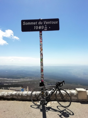 J'affectionne les sorties en montagne et moyenne montagne. Pour cela j'ai choisi un Axxome 350 équipé d'un groupe Ultegra R8000 mécanique; à l'avant le double-plateau standard et à l'arrière un dérailleur à chape longue et une cassette 11/34. Ce montage permet de monter les cols les plus raides sans trop se faire mal. J'ai inauguré mon nouveau vélo au Ventoux (grimpette côté Malaucène). C'est une sortie que je fais assez souvent, car j'habite à côté. J'ai donc pu juger de la différence avec mon vieux Colnago ! L'Axxome 350 est une belle machine, rigide, qui donne la sensation de faire corps avec elle. Elle tient parfaitement en ligne et les roues (des Ksyrium Elite) équipées de pneus Yksion Pro tubeless 25 autorisent les descentes rapides en toute sécurité, tant l'adhérence et le rendement sont top."