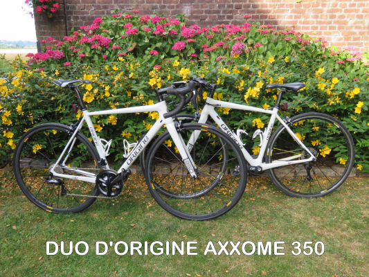 "Notre aventure Origine a commencé en mars 2017. A la recherche d'un vélo pour mon épouse, tout en prudence après une expérience aussi courte que désastreuse avec une très grande marque, nous avons été séduits et tentés par l'image flatteuse qui, déjà, se dessinait dans les médias. Habitant le département du Nord, il nous était facile de nous rendre à l'usine de MARLY et dissiper ainsi notre réserve d'alors sur le principe d'un achat en ligne. L'accueil reçu de Rémi Lefèvre fut très à la hauteur de nos attentes. Après un échange fructueux et très convivial, notre option finale fut un Axxome 350, option "flat bar", groupe Shimano Ultegra Di2, roues Mavic Ksyrium SL, périphériques Ritchey. Une très grande réussite, rare à ce point dans les gammes fitness. Sorties en duo, brevets cyclos du dimanche, escapades en montagne, tout en confort et en efficacité. Tombé à mon tour totalement sous le charme, je promis que mon prochain vélo serait un Origine. Engagement tenu en mai 2018, plus tôt que je ne l'avais prévu. Visite aux nouveaux locaux de SOMAIN, encore un super accueil de Rémi, avec qui on peut échanger pendant des heures ... Montage sur une base d'Axxome 350 II, tout juste présenté, mêmes couleur (blanc summit) et déco, groupe Shimano Ultegra Di2 (dont j'avais pu constater l'efficacité), roues Mavic R-Sys SLR, périphériques Ritchey. Rapport qualité-prix épatant. Livraison le jour de l'anniversaire de ma petite-fille, juste pour le clin d'oeil ... Immédiatement très bien posé, réglages minimum. Vélo léger, souple, confortable, agile. Un bonheur total. Pour moi une référence parmi mes nombreux vélos dans une pratique déjà longue. Depuis, nous ne manquons aucune occasion de faire autour de nous la promotion de nos machines et de la marque Origine. Bel exemple de réussite commerciale, amplement méritée. Long road, Origine ...!"
