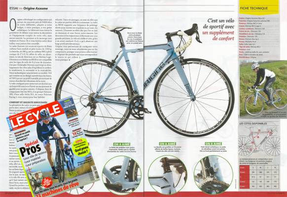 [...]Sur le plat, on descend les dents de la roue libre et le vélo file avec aisance. L'Axxome est un vélo qu'il faut mener avec du braquet, pour sportif dans l'âme, mais avec un supplément de confort.[...]Au sommet, l'Axxome accélère dès que l'on se met en danseuse et sans forcer outre mesure. Les descentes et les trajectoires s'effectuent avec une grande précision. Le vélo est stable et sain, grâce à un avant renforcé.[...] En grec, un axiome est un élément jugé digne, évident en soit. Le cadre de la jeune entreprise française Origine trouve écho à ce terme. Avec un cadre à la finition soignée et un montage à l'unisson, il apparait "évident" que ce vélo personnalisé à moins de 1900€ a sa place dans le monde du cyclosport.