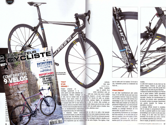 "Un super vélo" [...] "Il sait tout faire avec brio" [...] "Le vélo ne bronche pas, c'est un regal" [...] "Les Mavic R-sys SLR se retrouvent souvent sur un montage coûtant le double ou le triple de notre Origine" [...] "Pas dur à enmener, il fait partie des vélos qui