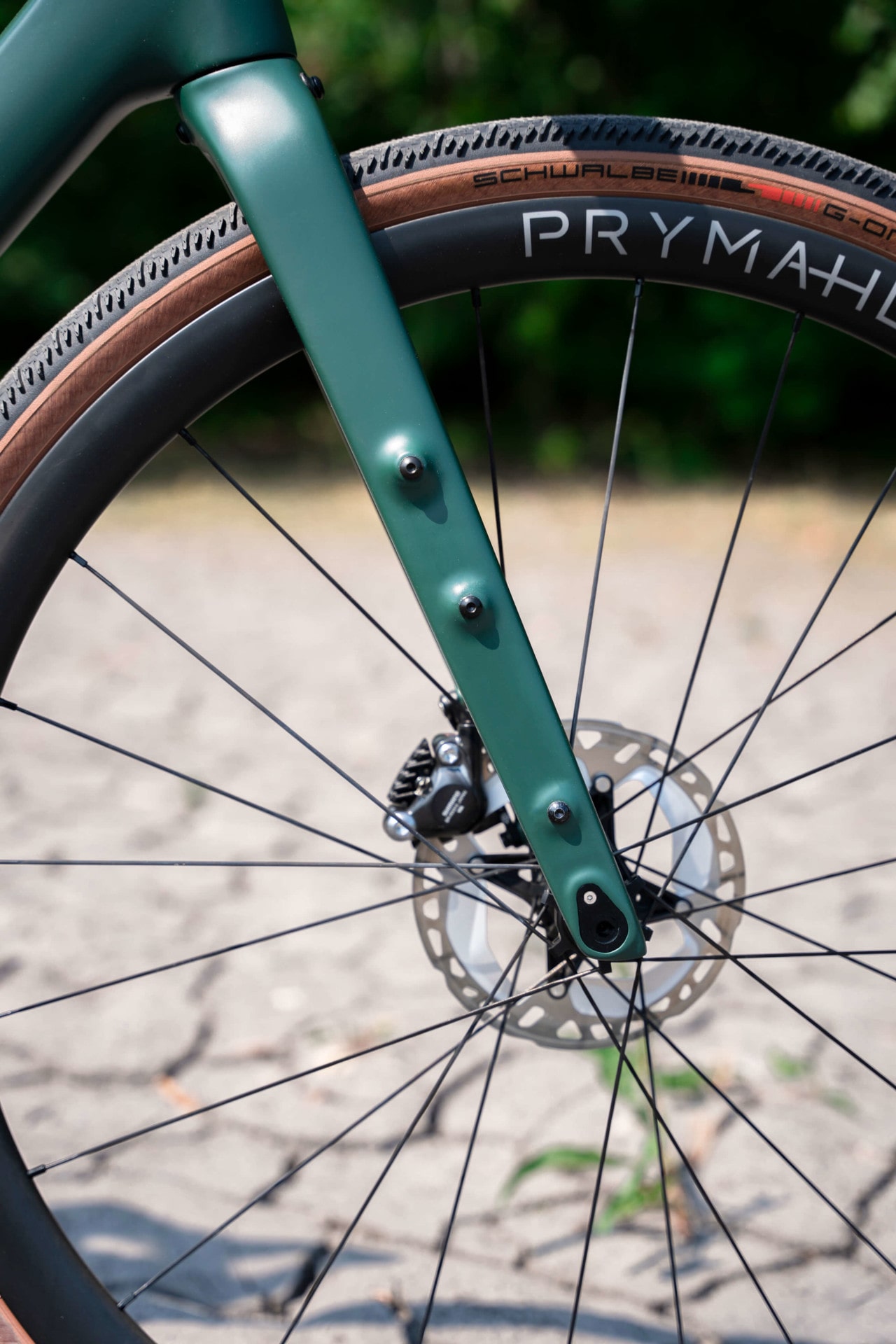 Een nieuw frame = een nieuwe vork. We behielden het recept van de OGV II om opnieuw een comfortabele, sterke en precies sturende voorvork te maken. Maar we voorzagen de OGV III van nieuwe montagenokken voor nog meer mogelijkheden om bidons en bagage te monteren. De vork is compatibel met remschijven van 180 of 160 mm. De montagenokken combineer je met Tubus Tara bagagedragers of standaard 64mm bidonhouders. De OGV III vork voorziet daarnaast in de integratie van de kabel van de naafdynamo.