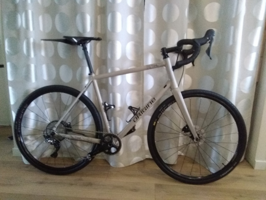 Du coup, l'hésitation n'a plus qu'été le choix du vélo (Graax ou Trail), le choix des composants et de la couleur. Du coup, j'ai opté pour le Trail Road avec le groupe Shimano GRX 600 1x11V, des roues Mavic Allroad et des pneus Tubeless Continental Terra Speed Protection 700x35. Je me suis orienté vers l'alu pour deux raisons : la première est budgétaire et la deuxième est que je souhaite l'utiliser pour du bike-packing ou carrément en configuration vélo de voyage en mettant des porte-bagages et l'alu me paraissait plus solide pour ces types de projet. Et franchement, je n'ai pas été déçu du tout de mes choix. Le vélo est une bombe tout en étant hyper confortable (je confirme la réputation d'Origine et de ses vélos confortables). J'avais un Cannondale Supersix Evo (vélo route carbone que j'ai vendu) et arrivait à tenir des moyennes de 28-29 km/h sur 50 à 70 kms en roulant seul et sur les mêmes parcours et à fréquence cardiaque moyenne identique, je ne perds que de 1 à 1,5 km/h de moyenne, mais me sens beaucoup moins fatiguer parce que le vélo et 10 fois plus confortable. Alors qu'est-ce que 1 à 1,5 km/h quand la compétition n'est pas un objectif ? Les pneus tubeless Conti passent partout, il suffit de jouer avec la pression en fonction du terrain sur lequel on roule et ils vous donnent entière satisfaction. Pour preuve, j'arrive à suivre mes potes VTTistes sur leurs parcours fétiches sur terrains secs (les 700x35 sur terrains gras sont quand même légers) en abaissant la pression. Il est vrai que les forêts de ma région (Ile-de-France) s'y prêtent bien parce qu'elles ne sont pas très techniques. Le groupe Shimano GRX répond du tac au tac et a l'air d'une fiabilité exceptionnelle. Les roues Mavic font le boulot. Et la couleur du vélo est tout simplement magnifique ! J'ai beau essayé de trouver des défauts (en bon français que je suis ????), je n'y arrive pas.