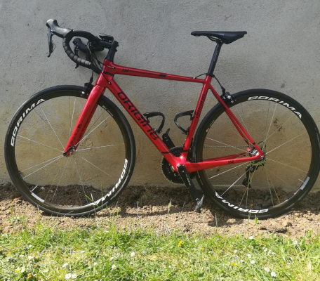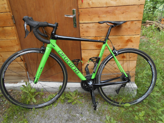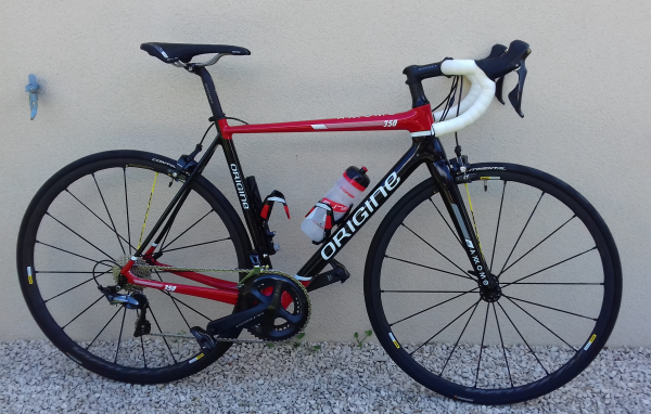 Acquisition d'un AXXOME II 350, roues Bora One 35 carbone, Groupe Dura Ace mécanique, freins à patins (en remplacement d'un Look KG 381 carbone à raccords alu collés des années 2000 en roues ksyrium SSC), après consultations des commentaires élogieux sur les cycles ORIGINE.